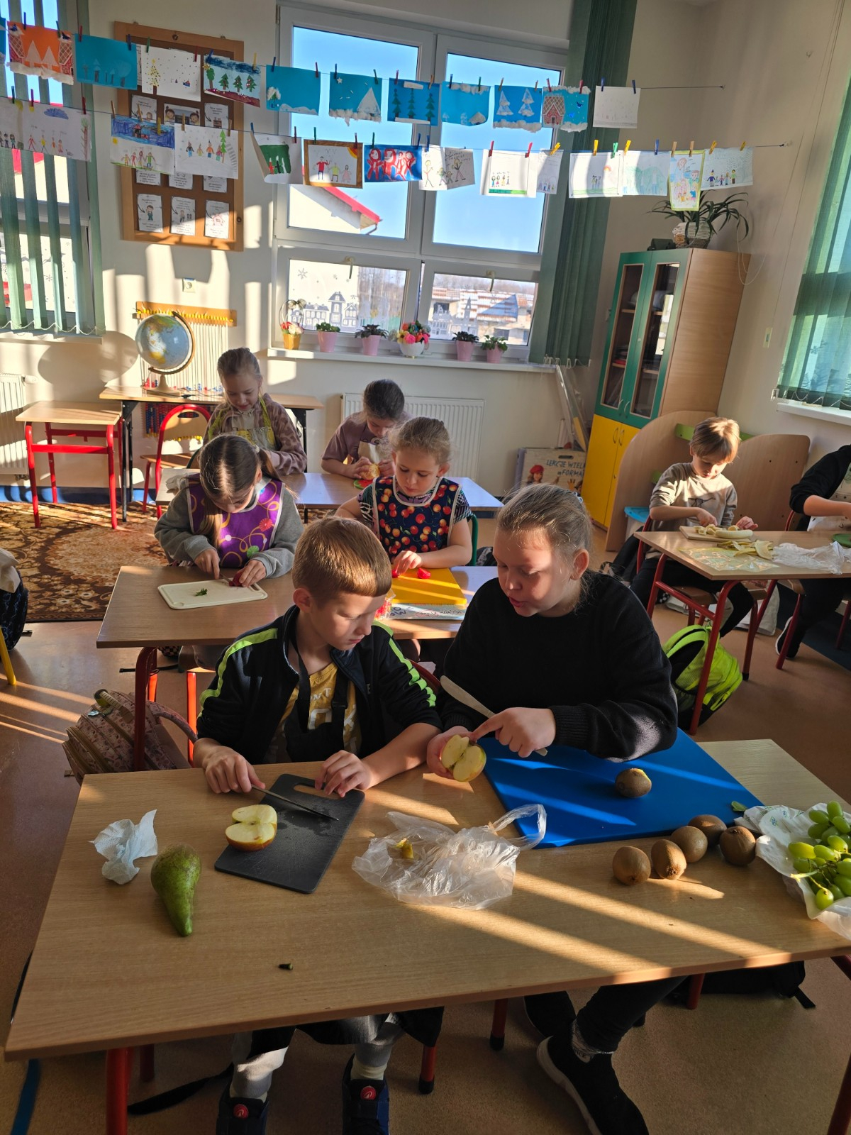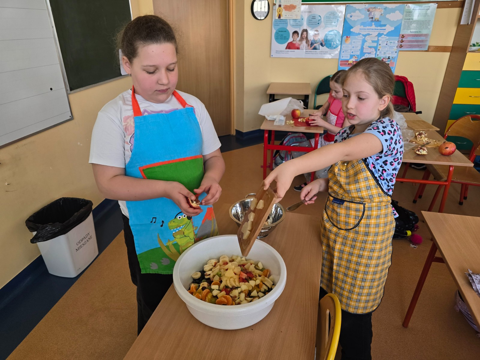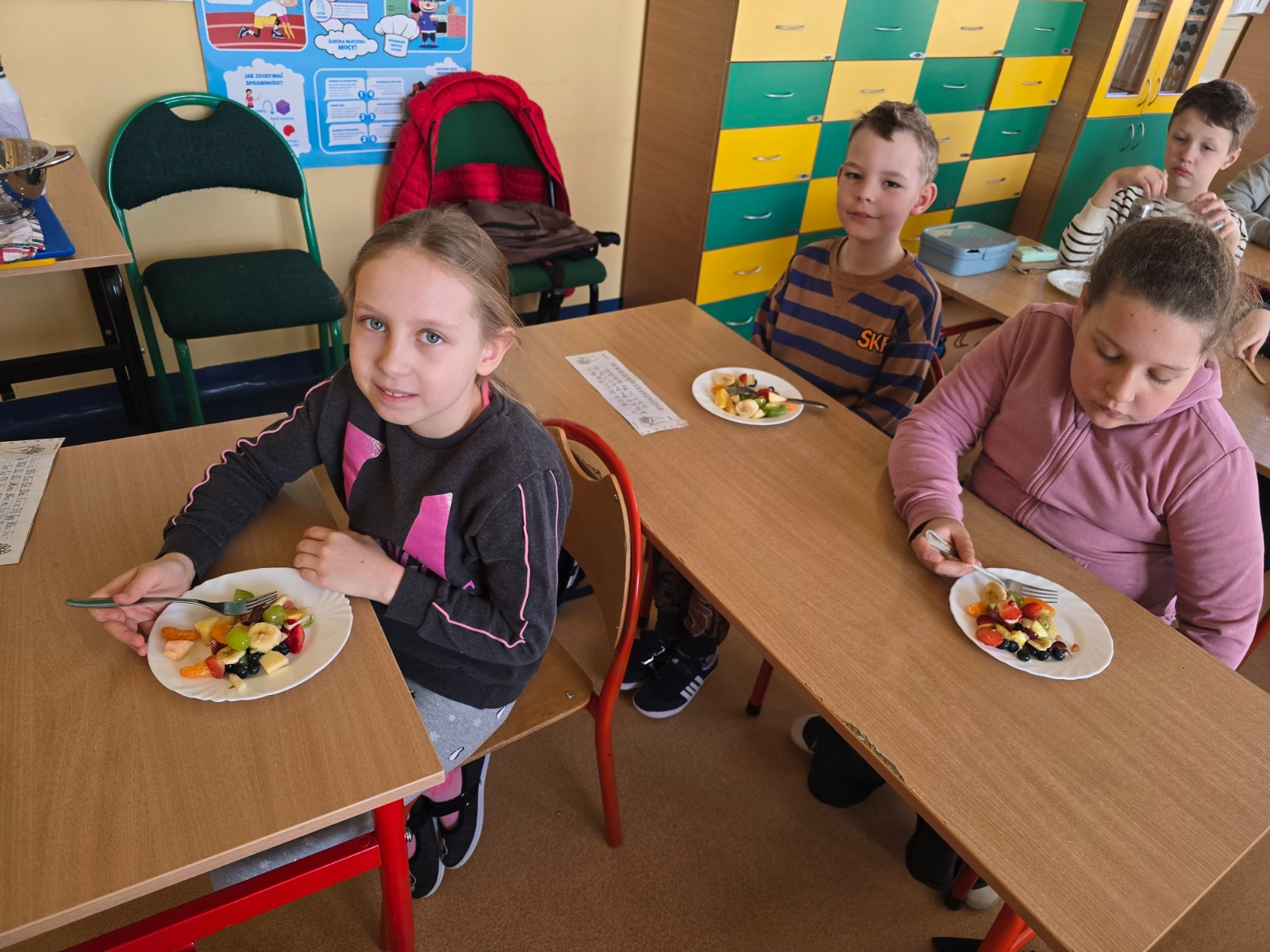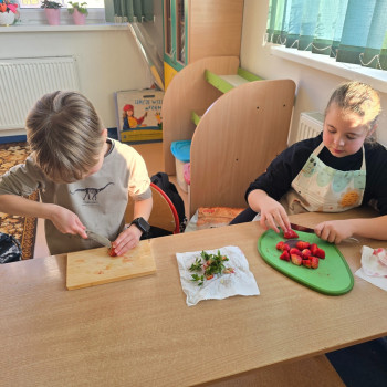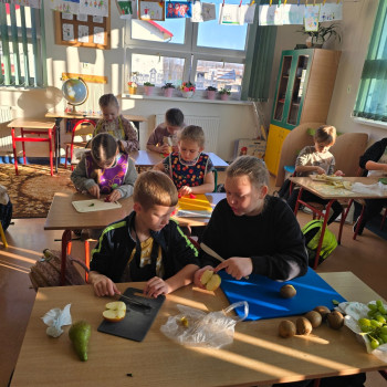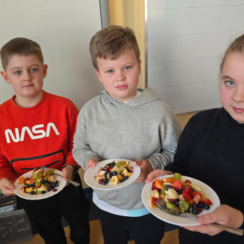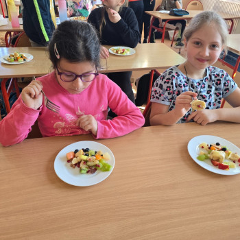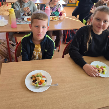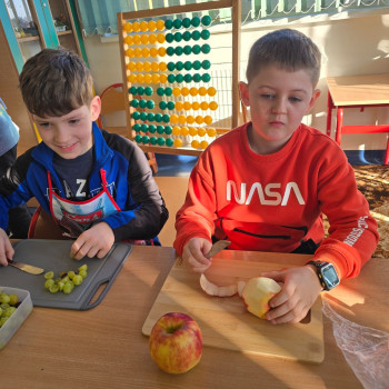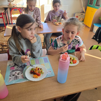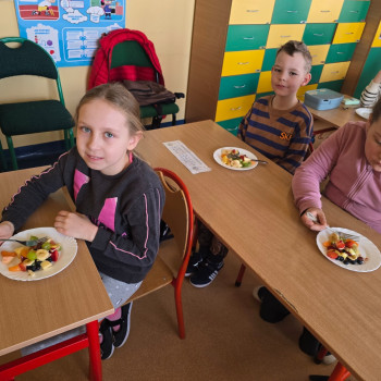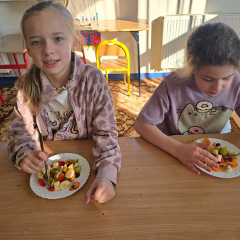 Klasa II w ramach projektu „Żyję zdrowo i kolorowo” przygotowała pyszną i zdrową sałatkę owocową. Współpraca między dziećmi była wzorowa – każdy chętnie angażował się w pracę, pomagając kolegom i koleżankom.